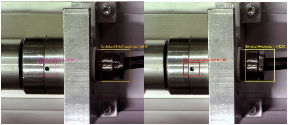 Die eingesetzte Objekterkennung erkennt beide Montageschritte zuverlässig (siehe Abbildung 6) und schaltet erst in den nächsten Montageschritt, wenn die Montageoperationen korrekt ausgeführt wurden. Dies stellt sicher, dass die entsprechenden Montageschritte nicht übersprungen werden. Um die Rückverfolgbarkeit zu gewährleisten könnte außerdem Bild- und/oder Videomaterial von den kritischen Montageschritte aufgezeichnet und in einer Datenbank gespeichert werden.