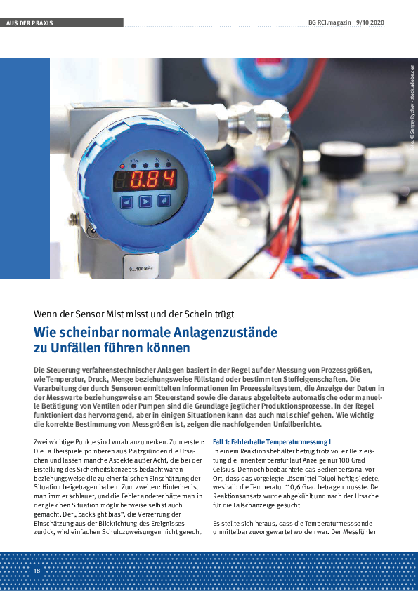 Die korrekte Bestimmung von Messgrößen hat eine zentrale Bedeutung für die Sicherheit verfahrenstechnischer Anlagen. Mögliche Ursachen für Fehlmessungen sollten im Sicherheitskonzept hinterfragt und die Steuerungskette mit Sensor, Verarbeitung und Aktor gegebenenfalls in sicherheitsgerichteter Funktion ausgeführt werden. Insbesondere bei Wartungsarbeiten ist darauf zu achten, dass die Funktion der Messwertaufnehmer nicht beeinträchtigt wird. Das Anlagenpersonal sollte sensibilisiert werden, unplausible Anzeigen unverzüglich zu melden.
